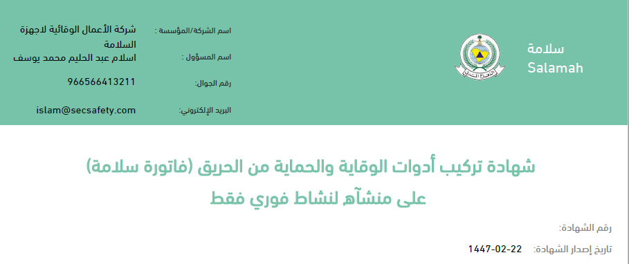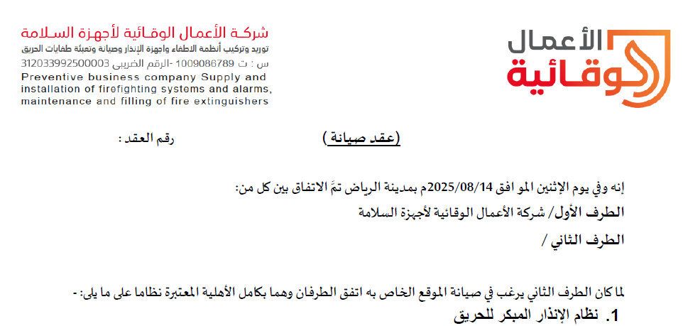 تقوم شركة الأعمال الوقائية بعمل عقود الصيانة لجميع المؤسسات والشركات من أجل حصولهم علي ترخيص الدفاع المدني والبلدية، وتتضمن عقود الصيانة الزيارات الدورية والطارئة مع تقديم التقارير الدورية للعميل وللدفاع المدني حول سلامة الموقع ، ويتم توثيق العقد عبر منصة سلامة.